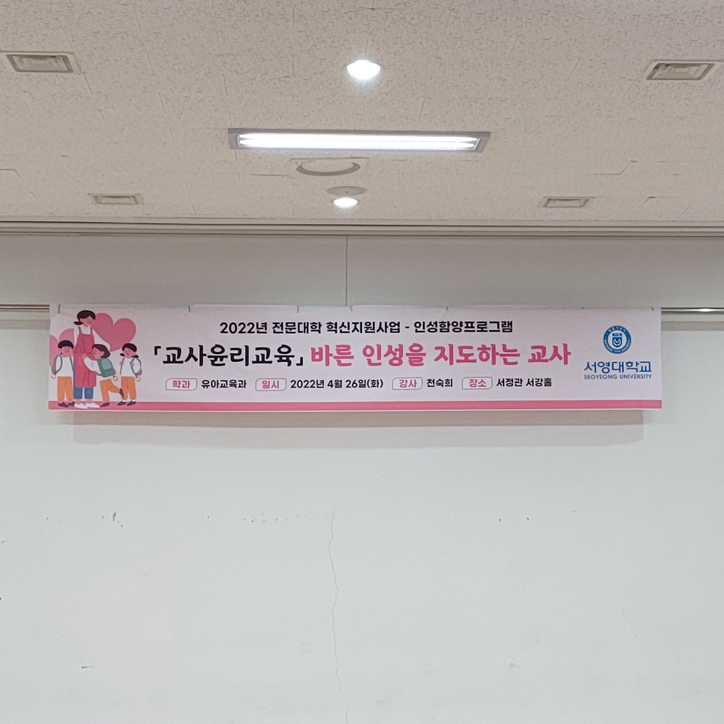 - 내용 : 교사가 교직 생활에서 지켜야 하는 실천 규범인 교사 윤리의 개념, 유아 교사가 지녀야 할 교직 윤리, 교사 윤리 교육이 예비 유아 교사에게 미치는 영향, 유아 교사로서의 인성 함양, 유아의 바른 인성을 지도하는 유아 교사에 대한 내용들을 질문과 반응을 통해 학생들과 적극적으로 소통하였습니다.