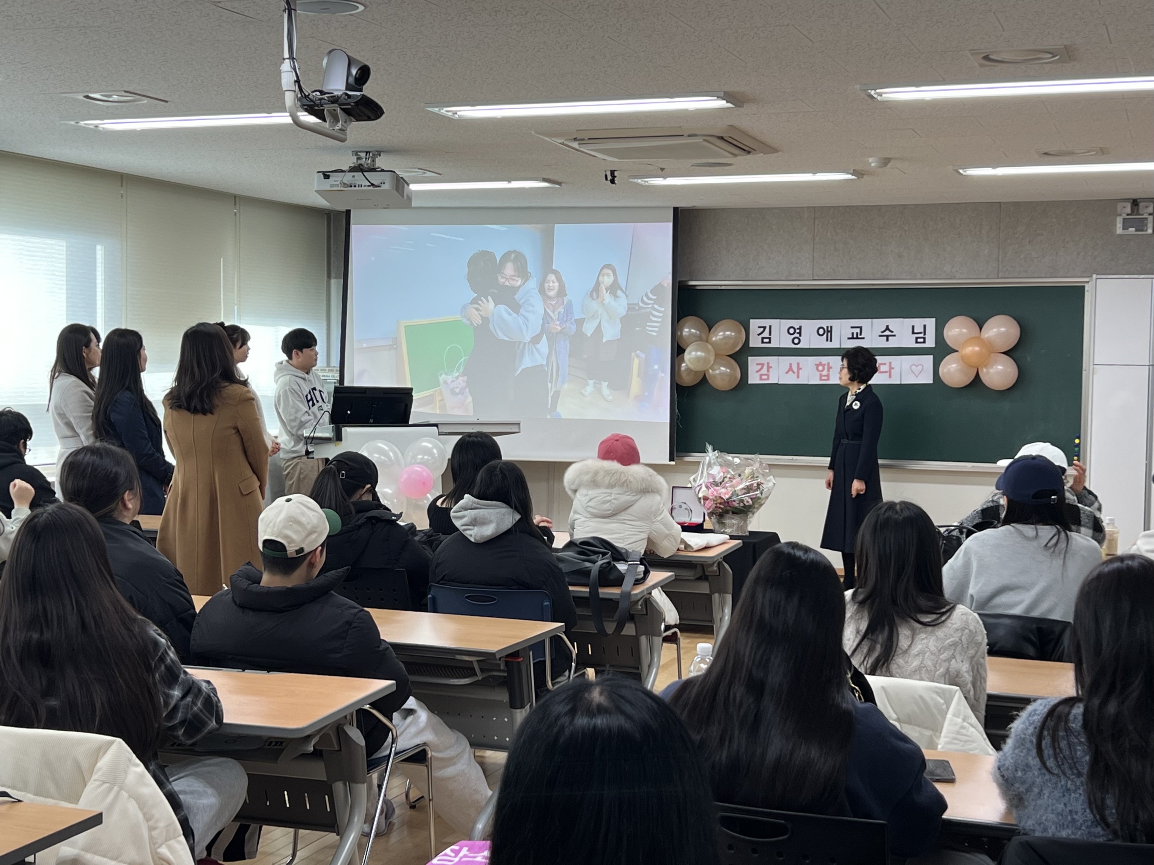 - 내용 : 약 43년간 서영대학교를 빛내주신 김영애교수님 퇴임을 맞이하여 유아교육과 전임교수님, 학생회를 비롯한 서영대학교 유아교육과 재학생들이 퇴임식을 준비하였습니다. 김영애교수님의 노고에 감사드립니다.