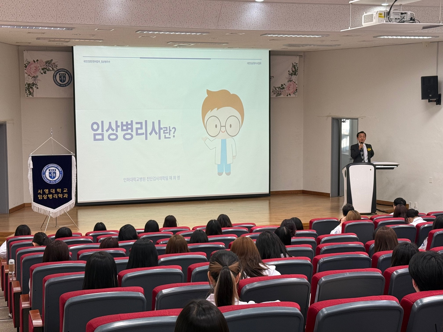 화이트 가운 수여식 이후에는 채희영 회장님께서 임상병리사의 진로와 다양한 진출 분야, 미래 비전에 대해 특강을 진행했다. 특히 채혈 실습의 중요성을 강조하며, “학교에서 기본기를 탄탄히 다져야 현장에서 경쟁력을 갖출 수 있다.”고 조언을 아끼지 않았다.