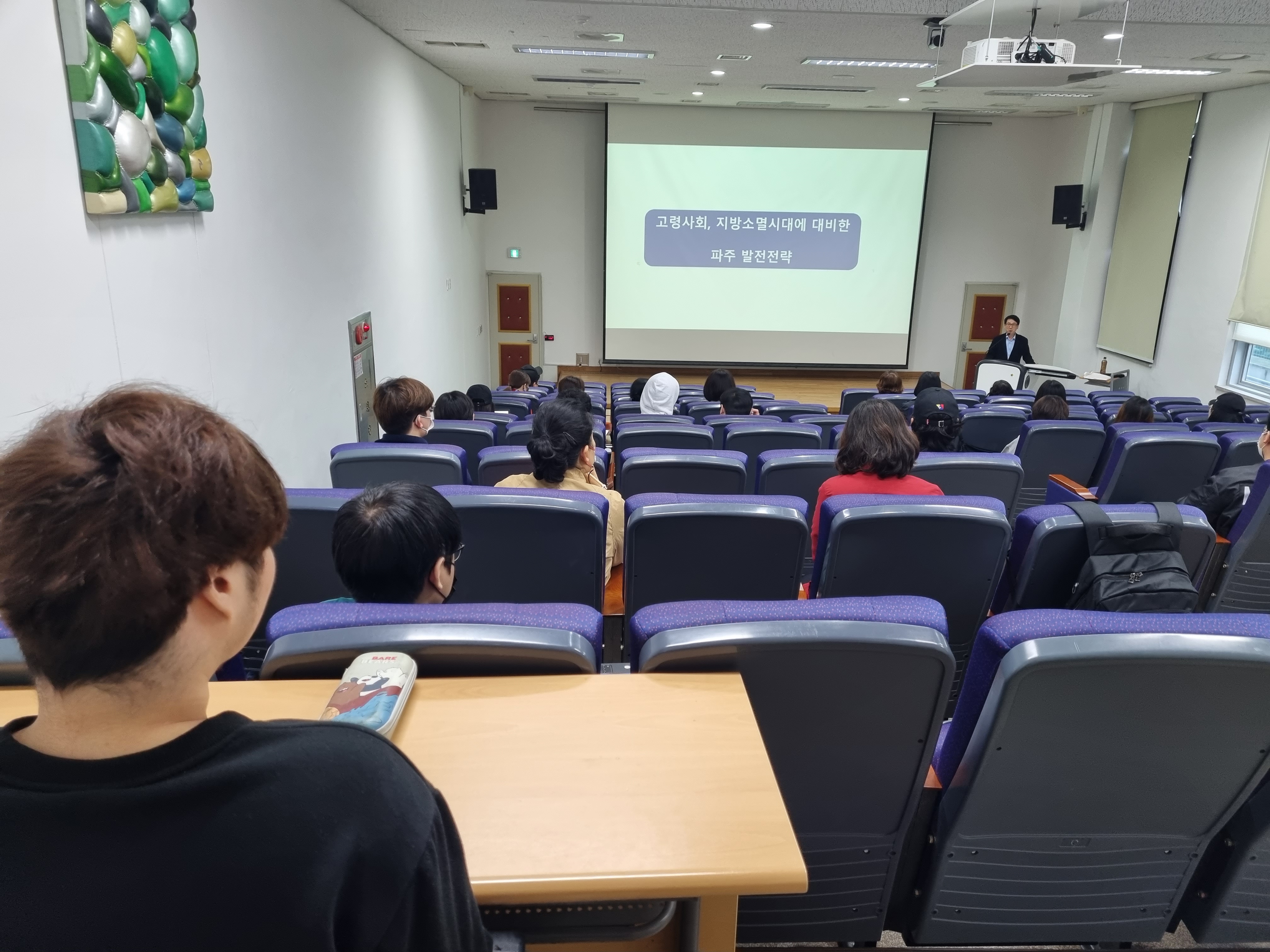 3월28일, 4월5일 이틀에 걸쳐 “ 고령사회, 지방소멸에 대비한 파주 발전 전략 ”이란 주제로  고령사회, 저출산으로 인한 파주 지역사회의 문제점을 파악하고 다양한 파주시 정보를 전달하면서 파주 발전 전략에 대한 비전을 제시하였습니다.